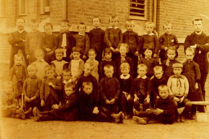 Een zeldzame foto uit 1890. Ze is genomen voor de nieuwe openbare school aan de Pastoor Vranckenlaan de latere jongensschool. De school was dat jaar nog gemengd. Het jaar daarop gingen de meisjes naar school in het klooster. Er zijn veel meer jongens dan meisjes, omdat er nog geen leerplicht was. Meisjes konden thuis helpen. In de 2e rij links staat een dochtertje van bakker Houben, later mevr. Thijssen-Engelen. Linksboven meester Dohmen en rechtsboven meester Ferdinand Schrijvers, de oom van To Ickenroth-Janssen.To Ickenroth-Janssen was de dochter van Bertus Janssen en Eleonora Schrijvers, een zus van Ferdinand Schrijvers. Ze woonden aan de Broeklaan tegenover het lager van Janssen-Willemsen. To trouwde met Willem Ickenroth in Beesel