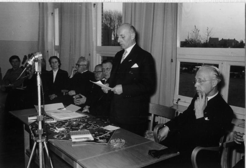 Landbouwhuishoudschool gebouwd in 1950. Mater Amabilisschool geopend in 1954 door de heer Houben, commissaris van Koningin in Limburg. De inzegening is geschied door pastoor Ceyssens. Rechts burgemeester Claessen.