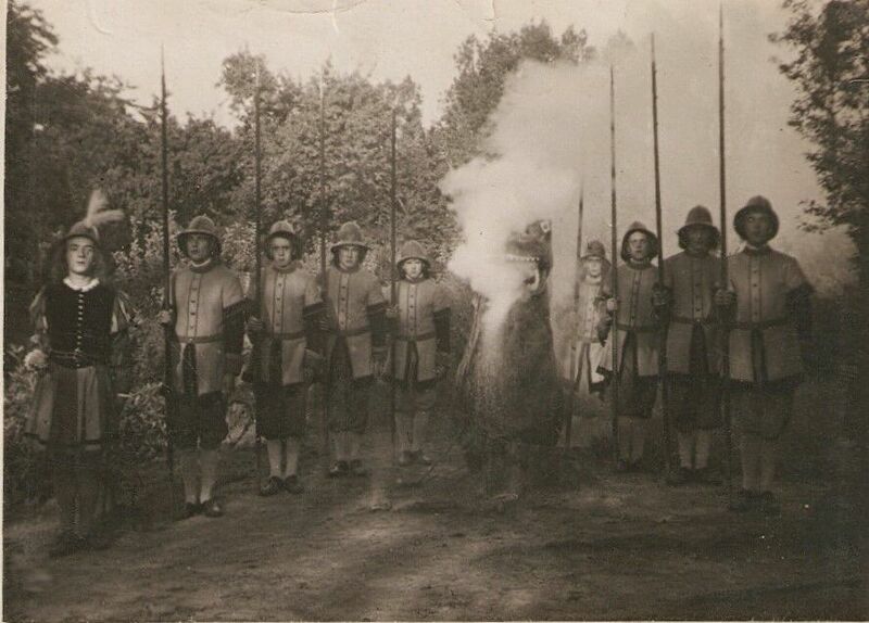 Draaksteken in Beesel langs de Maas. De kleine man links langs de draak is Drees Simons.