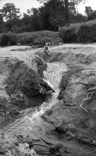Monding van de Schelkensbeek. De Maas staat zeer laag omdat de stuwen vanwege onderhoud zijn gestreken. Dat was in juli 1969. De persoon op de foto is Maria van Gassel-Goossens.