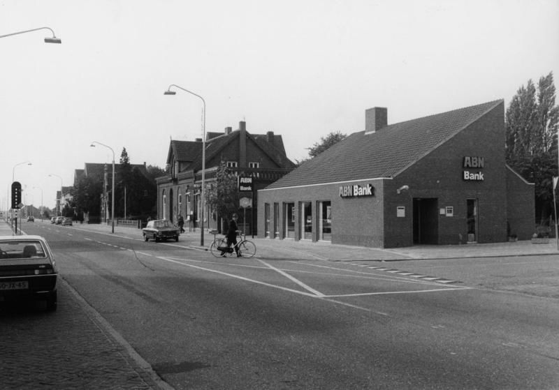De Rijksweg ter hoogte van het tankstation / winkel H. Dohmen. Achter de ABN-bank het voormalig postkantoor afgebroken kort na 1982.