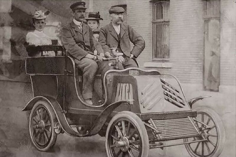 Foto van de eerste Konings-auto met achter het stuur Ferdinand Anderheggen (ontwerper van de transmissie) rechts Peter Konings en achterin zijn drie dochters.