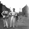 "De Rijksweg in Reuver, kijkend richting Belfeld in 1932. Op de voorgrond "Sjoester" Lei Rutten (1904-1961) met trompet."