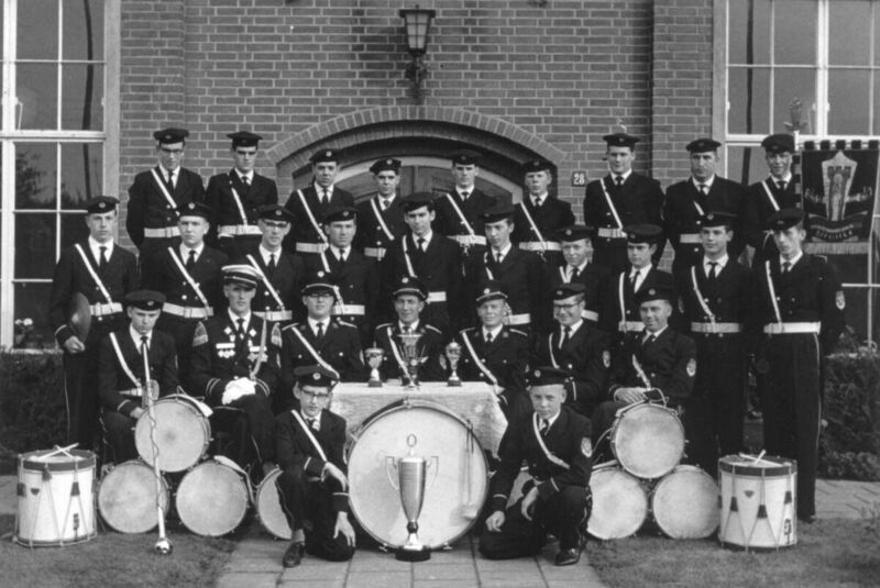 Van links naar rechts: Bovenste rij Jan Gijzen , Jo Derix , Harrie Janssen, Jack Janssen , Jo Killaars , Wiel v/d Velden , Har v/d |Velden , Piet Killaars , W. Crommetuin, 2e rij van boven: Lei Hermans , Toon Jacobs ,Michel Peulen , Ben Janssen , Har Thijssen , ? , J, Schoolmeesters H.Veldman , W. Steeghs , S. Steeghs zIttend Sjra Gijzen , Har Knops , Har Stevens ? , Toon Roelofs , Pierre van Wylick , Coen Janssen . Harrie Franssen Op de knieën Bongers en Ger Janssen de latere dirigent