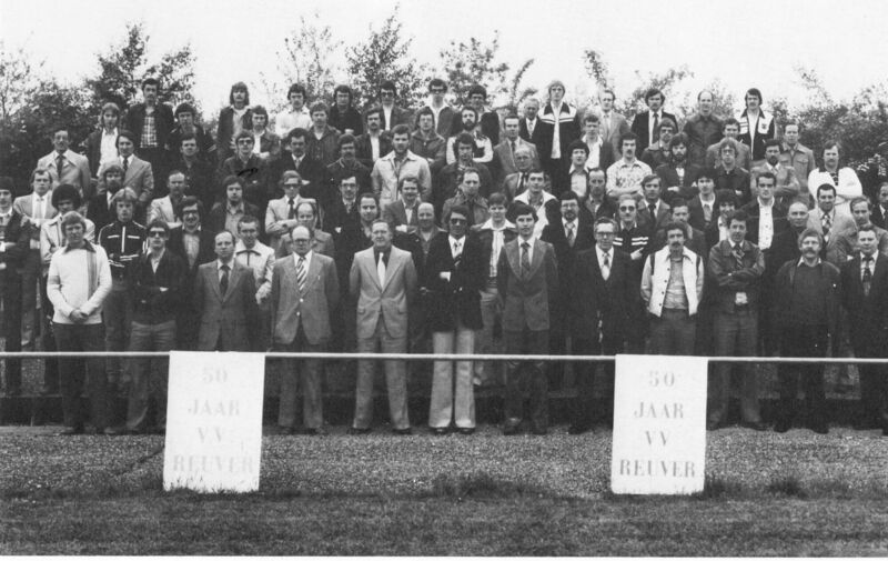 Groepsfoto van Voetbalvereniging Reuver bij gelegenheid van hun 50 jarig bestaan in 1978.