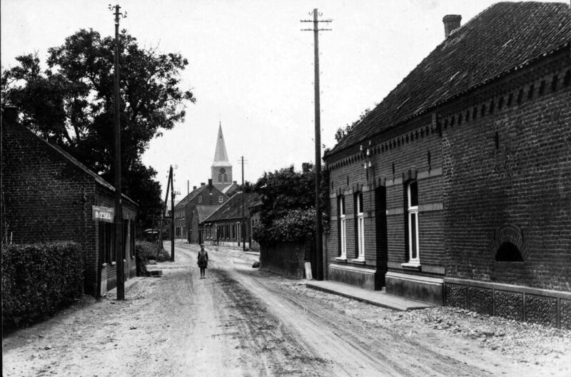 De Dorpstraat (tegenwoordig Monseigneur Theelenstraat) in Beesel zoals deze er in het begin van de 20ste eeuw uit zag. De foto is genomen ter hoogte van Monseigneur Theelenstraat 15 (woning rechts).