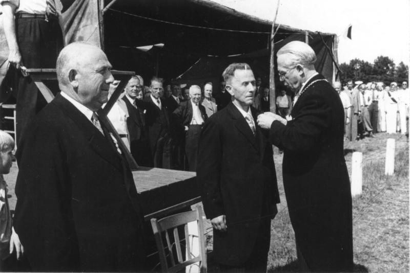 van links naar rechts: 1. Bert Peeters 2. Ko Custers. 3. burgemeester Claessen. Op de achtergrond de voorzitter van Hercules; G. Bosmans.
