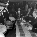 Harmonie St. Gertrudis. Pastoor Gerris, Burgemeester Moonen, Dr. Crasborn bezichtigen hier de nieuwe uniformen van de jeugdige trommelaars van de Harmonie.