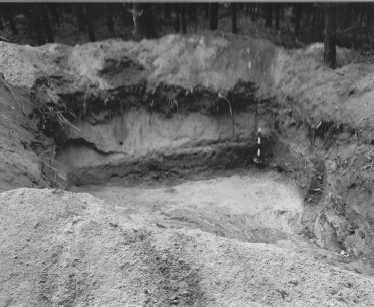 Proefopgraving Romeinse pannenoven Krekelbergsheide. Profiel met afvallaag oven bedekt door rivierduinzand.