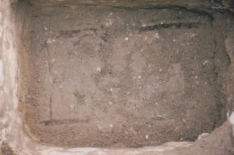 Opgraving kerkhof Ouddorp. Sporen van een houten kist.