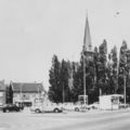 De markt in Reuver met op de achtergrond de kerk en winkels aan de Pastoor Vranckenlaan en op de voorgrond de friteskraam.
