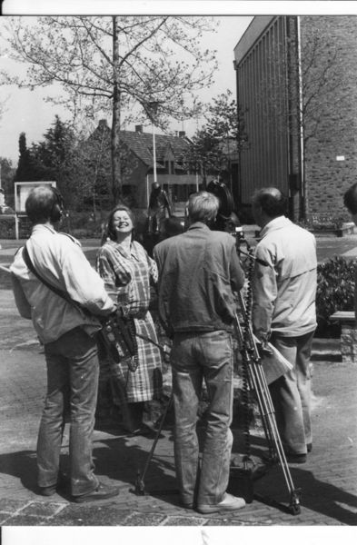 Claartje Muysers-Feyen bij het monument "De kleisjtaeker" bij de opnamen voor het programma "Van gewest tot gewest". Opnamen NOS van Gewest tot Gewest.