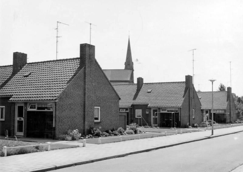 Opname van de bejaardenwoningen gelegen aan Rustoord. Deze woningen werden gefaseerd (tussen 1956 en 1964) gebouwd door gemeente en later overgenomen door Woningbouwvereniging.