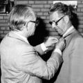 Burgemeester J.T.Hendrix speldt Jac. Laumans een onderscheiding op.