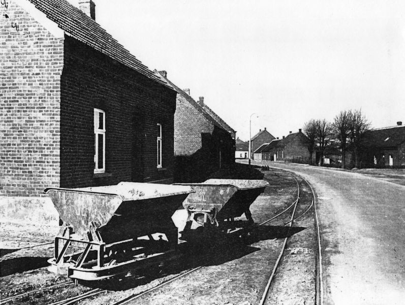Keulseweg met rails en kiepwagens. Rechts met bomen voor het huis: huis Chris v.d. Velden. Op de voorgrond kleiwagentjes van greswarenfabriek Laumans. 1956
