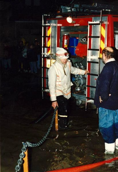 Brandweer Belfeld in actie bij overstroming van de Maas in 1993. Bevelvoerder Wim Hendriks.
