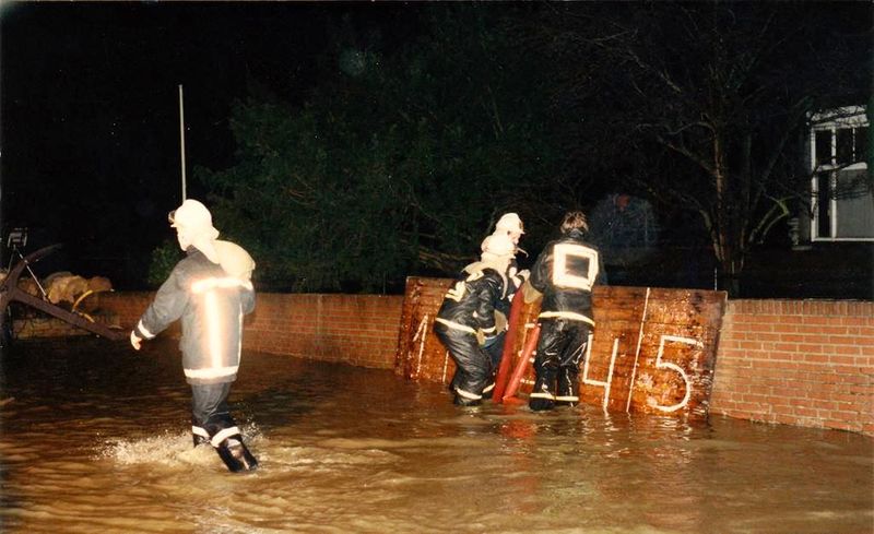 De vrijwilliger brandweer Belfeld in actie bij café Maaszicht tijdens de overstroming van 1993.