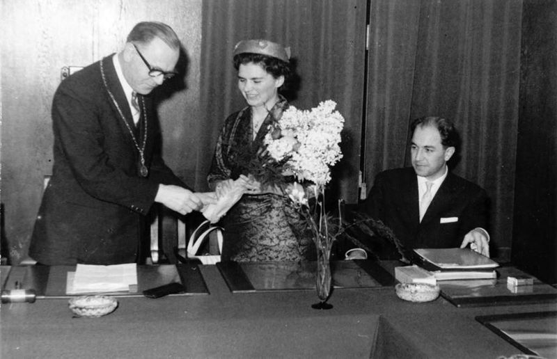 Mevr. Kessels krijgt uit handen van burg. Mooren een boeket bloemen.