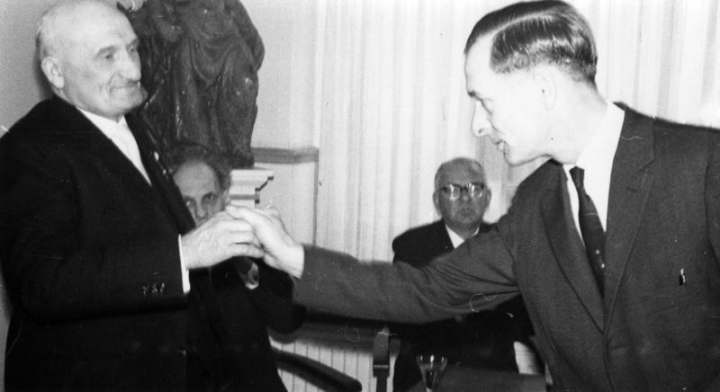 Voorzitter O.R. greswarenfabriek Teeuwen, Piet Vincent, feliciteert de gouden jubilaris W. Ickenroth op het kantoor van de fabriek in Tegelen, vanwege de ontvangst van de bronzen medaille van de Orde van Oranje Nassau.