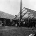 Onder het wakend oog van een der directeuren verplaatst het personeel het karkas van een loods.