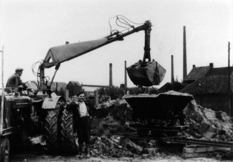 Piet v.d. Beucken en Graet Janssen bij het laden/lossen van de kiepkarretjes greswarenfabriek Janssen-Willemsen.