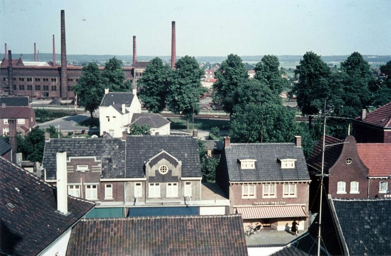 Vanuit de kerktoren zicht op de praktijk van dr. Crasborn en de greswarenfabriek Janssen-Willemsen. Op de voorgrond de fournituren winkel vanTheeuwen-Hermans, daarna Cox.
