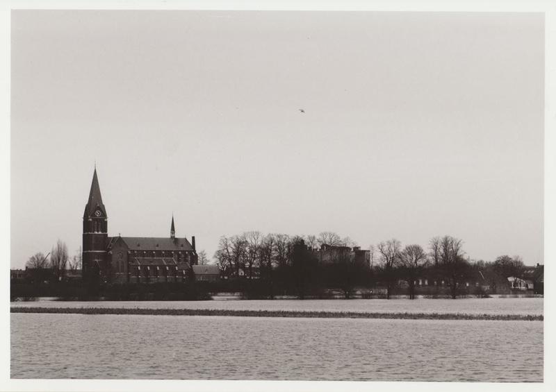 Hoog water van de Maas. De kerk en het kasteel van Kessel gezien vanuit de Kesselseweg in Reuver.