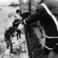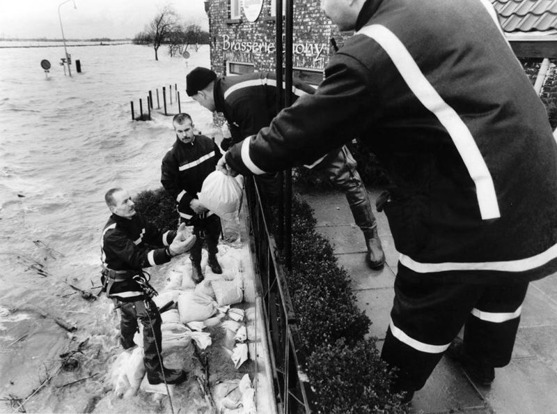 Hoog water. Terras "Maaszicht" dreigt weg te spoelen.