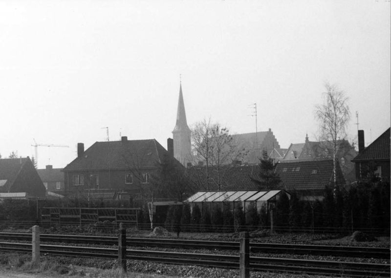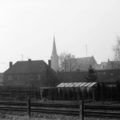 Het spoor en de kerk gezien vanuit de fabriek van Janssen-Willemsen.