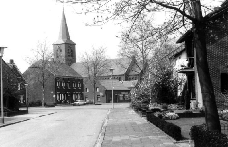 Het marktplein Beesel met café Allerhand, later Troubadour, op achtergrond de Sint Gertrudiskerk.