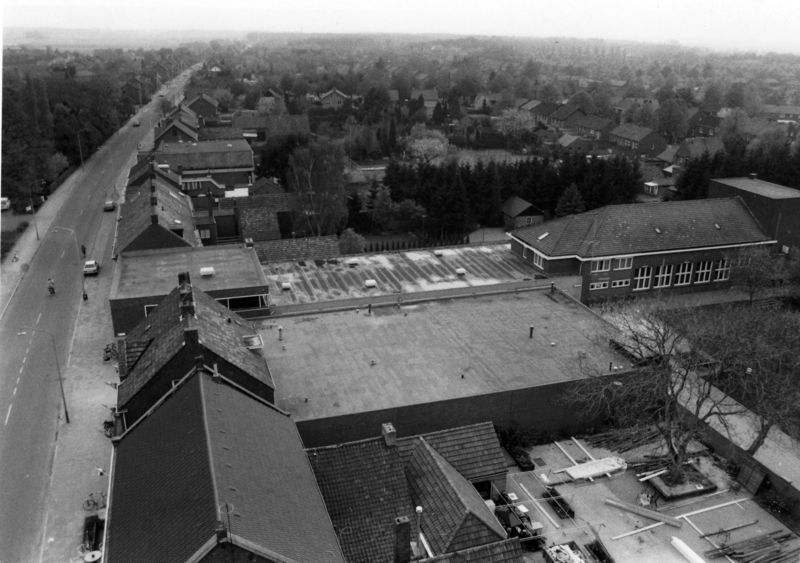 Vanuit de kerktoren gezien naar het zuiden: de Pastoor Vranckenlaan en het Piusgebouw; rechts de tuin bij café Ronckenstein.