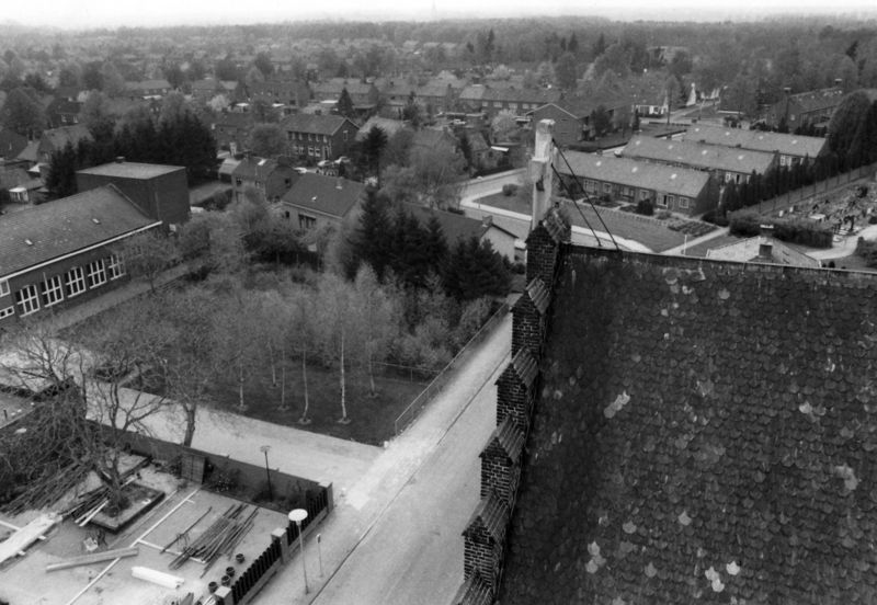 Vanuit de kerktoren gezien links het Piusgebouw en verder het Reuversveld.