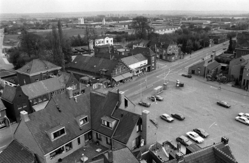 Gezien vanuit de kerktoren het Raadhuisplein en de Rijksweg.