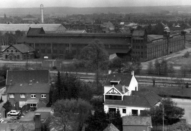 Gezien vanuit kerktoren: Voorgrond Wilhelminalaan en op de achtergrond fabriek Janssen-Willemsen