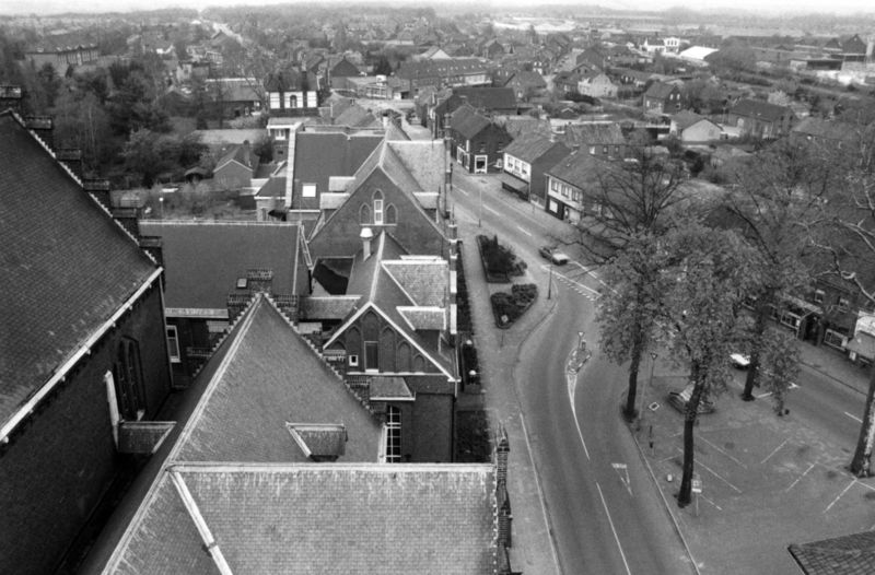 Gezien vanuit de kerktoren gezien naar het noordoosten met de kruising Rijksweg / Past. Vranckenlaan.