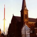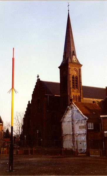 Deel van de markt met op achtergrond St. Lambertuskerk. Op het marktplein de mast van de windjbuujel.