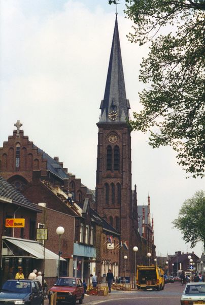 Winkel De Edah, voorheen drogisterij van Gassel - Goossens, wordt afgebroken. Op de achtergrond de St. Lambertuskerk.