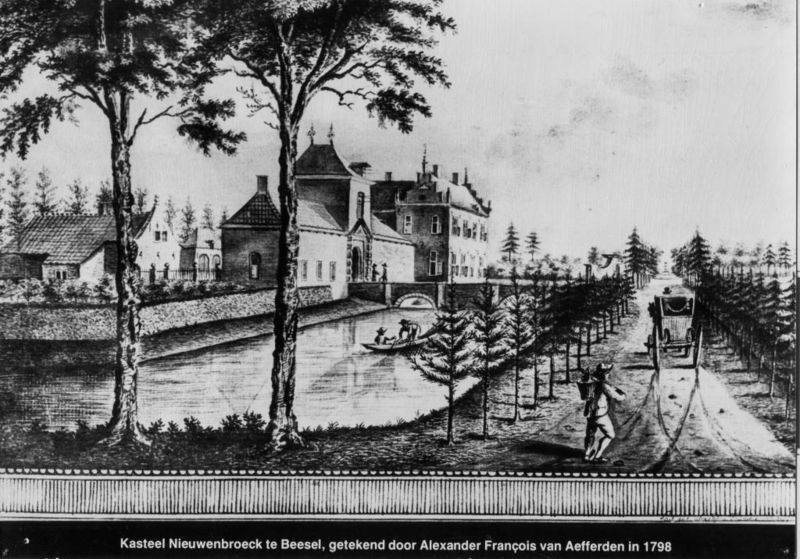 Kasteel Nieuwenbroeck te Beesel, getekend door Alexander Francois van Aefferden in 1798