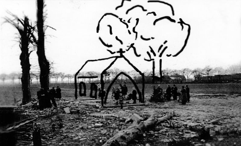 een onbekende is het silhouet van de kapel en boom op de foto ingetekend.