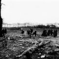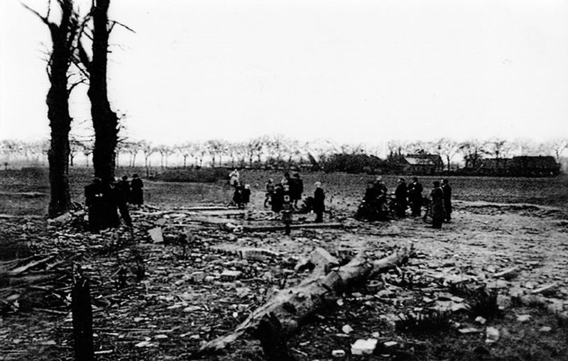De restanten van de kapel van Geloë en lindenbomen in Belfeld na de bominslag van 1943.