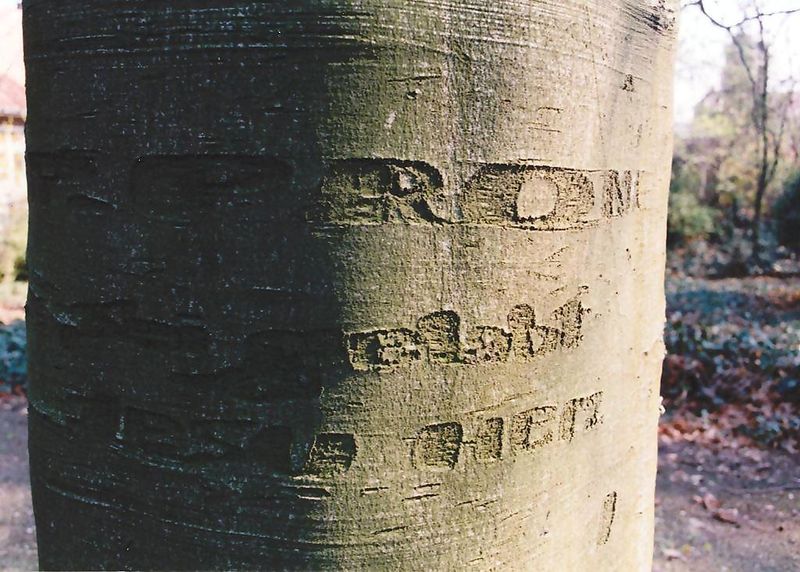 Ingekraste naam op beukenboom in de tuin van het Theresiaklooster in