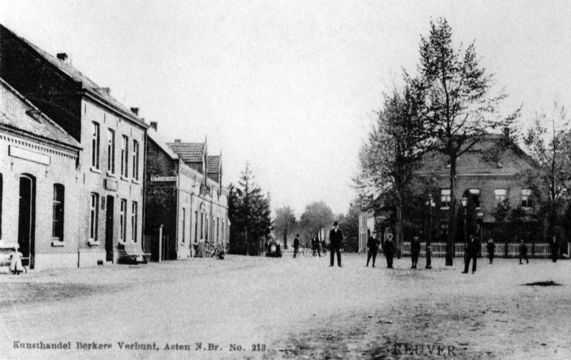 Prentbriefkaart van de Rijksweg met links Rutten dan bakker Houben. Rechts woning notaris Vogels.