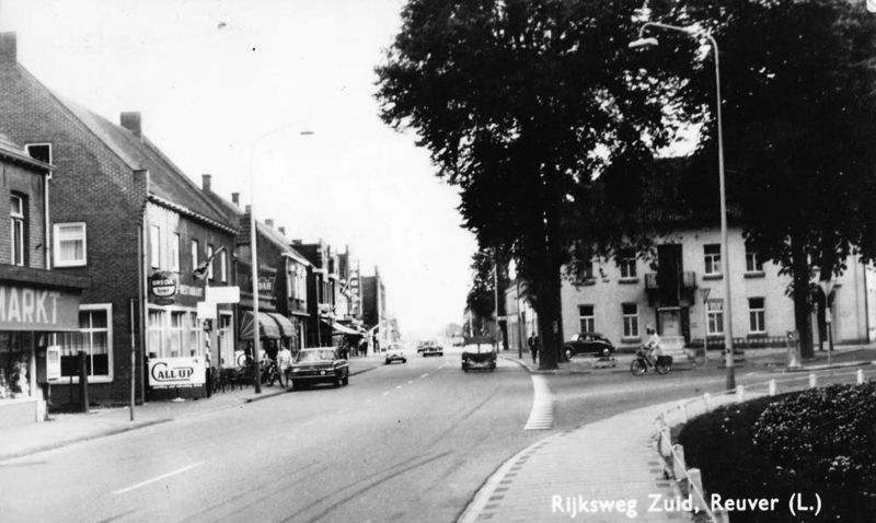 Prentbriefkaart van het Centrum Reuver met raadhuis en H. Hartbeeld