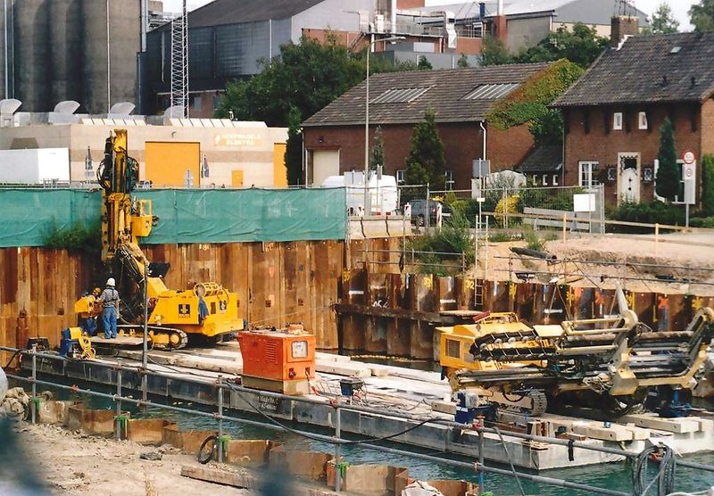 Aanleg A73 en tunnel. Op de achtergrond de moutfabriek.