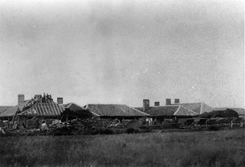 Julianastraat en de Wilhelminastraat en Prins Frederikstraat. Foto gemaakt in 1926 tijdens de uitbreiding van het bedrijf met twee ovens en een bergloods.