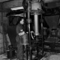 Lei Knops aan de buizenpers in de gresbuizenfabriek van Janssen-Dings in Belfeld.