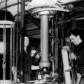 Jan Wolters (links) en A. Stevens aan de buizenpers in de gresbuizenfabriek van Janssen-Dings.