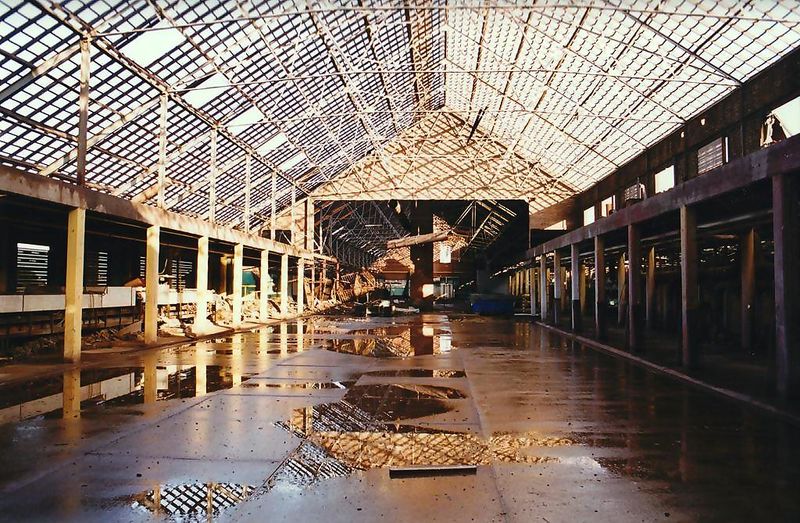 Voormalige gresbuizen en tegelfabriek van Janssen-Dings kort voor de sloop. Vanuit interieur naar noorden.