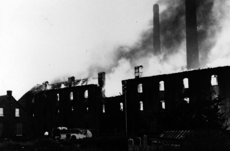 Grote brand in de gresbuizenfabriek bij kleiwarenfabriek NGI in Belfeld op 10 juni 1964.