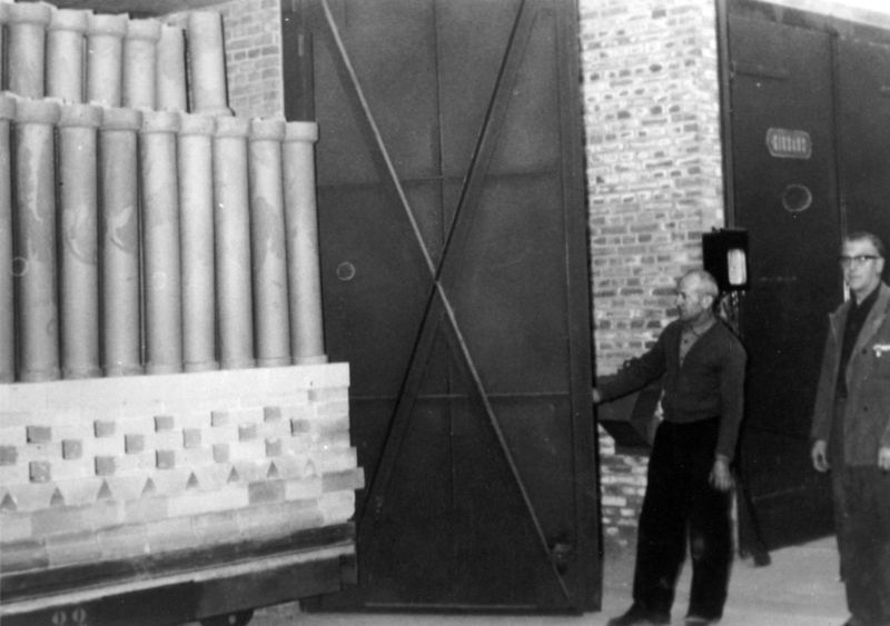 De ovenwagen met stenen en buizen wordt de oven ingeduwd bij NGI.